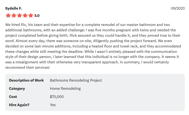 I am so happy with my new bathroom. Especially happy that I hired Dezign Construction to do the job. The completed remodeling project was far beyond my expectations. Rick managed the entire work and teams. He listened to my ideas and gave amazing advice regarding how to achieve my vision.