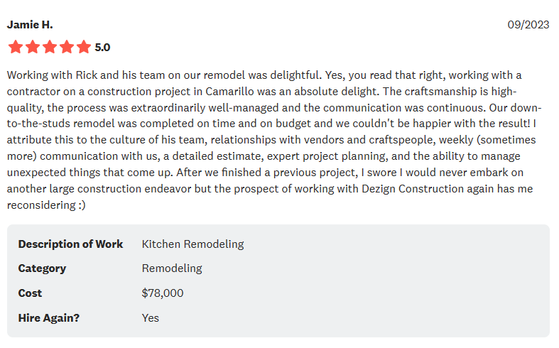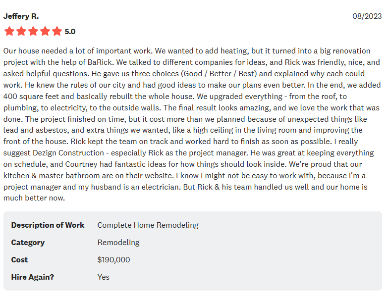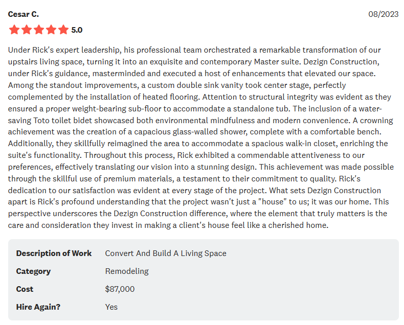 I reached out to Dezign Construction in May for our ambitious kitchen and master bathroom remodeling endeavor, and their response was immediate and impressive. At the forefront of my decision to choose this company was Rick, whose role proved pivotal throughout the entire process.