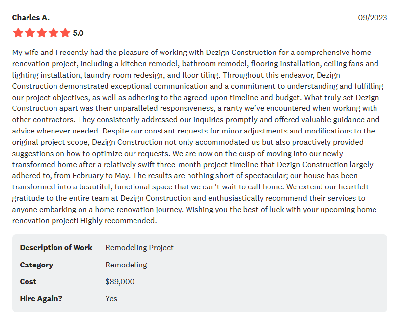Ready for a stunning transformation? Dezign Construction is offering an exclusive 25% off on your next project! Elevate your space with premium materials and expert craftsmanship. Limited-time offer, act now! Click to claim your discount and turn your vision into reality with Dezign Construction.