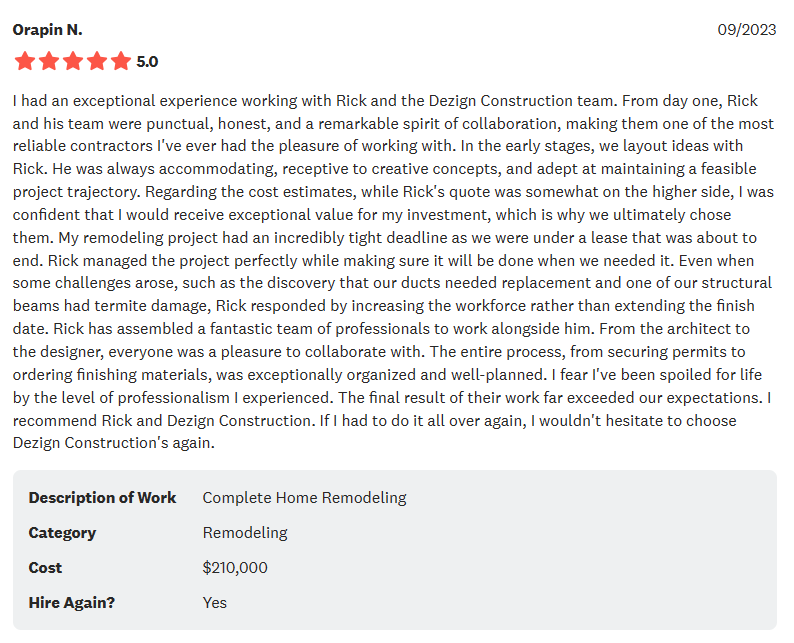 I had an exceptional experience working with Rick and the Dezign Construction team. From day one, Rick and his team were punctual, honest, and a remarkable spirit of collaboration, making them one of the most reliable contractors I've ever had the pleasure of working with. In the early stages, we layout ideas with Rick.